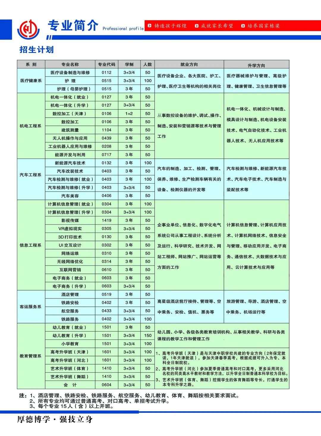 注:1、酒店管理、铁路安检、铁路服务、航空服务、幼儿教育、体育、舞蹈按相关要求面试。