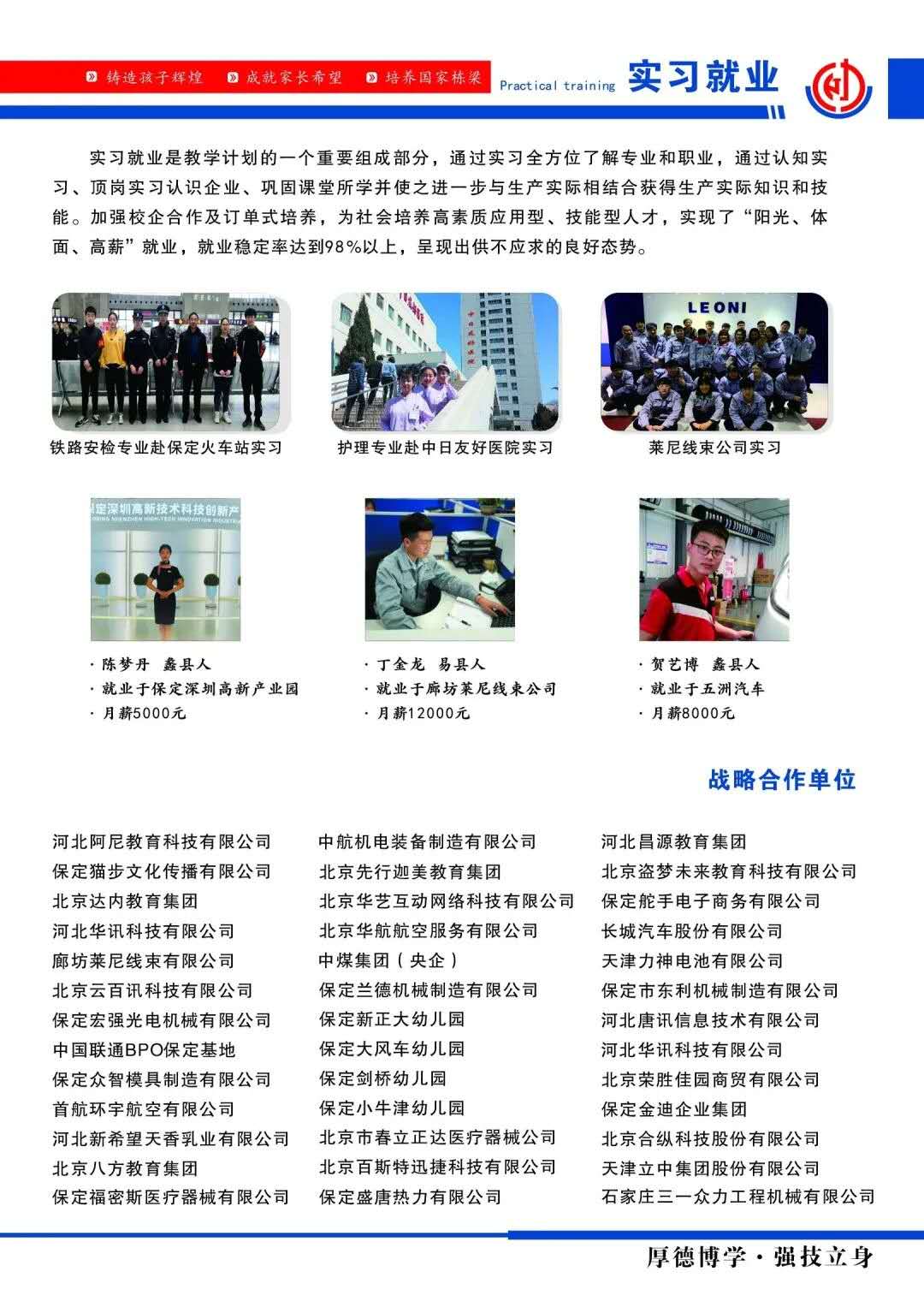 保定动力工程技术技工学校依靠自身的优势,推行“向大企业进军,与领军企业携手”战略,加强校企合作,实施“订单式培养”,确保毕业生就业稳定率98%。学校与长城汽车、北京汽车、北京奔驰、中国中煤能源集团、天津力神、北京铁路局、中国电信、剑桥幼儿园、森林国际幼儿园、北京华航航空服务有限公司、中航工业等大型企业建立合作关系,实现了毕业生“阳光、体面、高薪”就业,呈现出毕业生供不应求的良好态势,实现了“送来一个孩子,脱贫一个家庭”美好愿景。